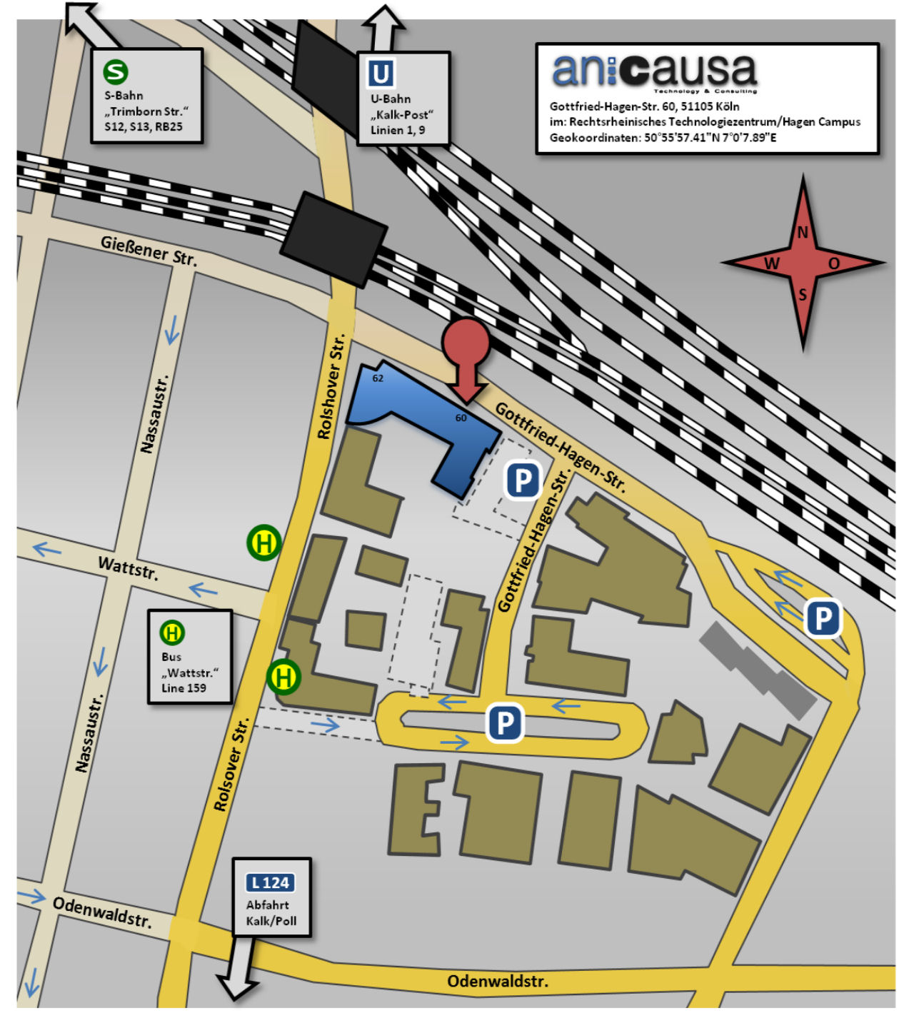 Von Köln-Deutz oder Hauptbahnhof kommen Sie am einfachsten mit der S-Bahn ans Ziel.
