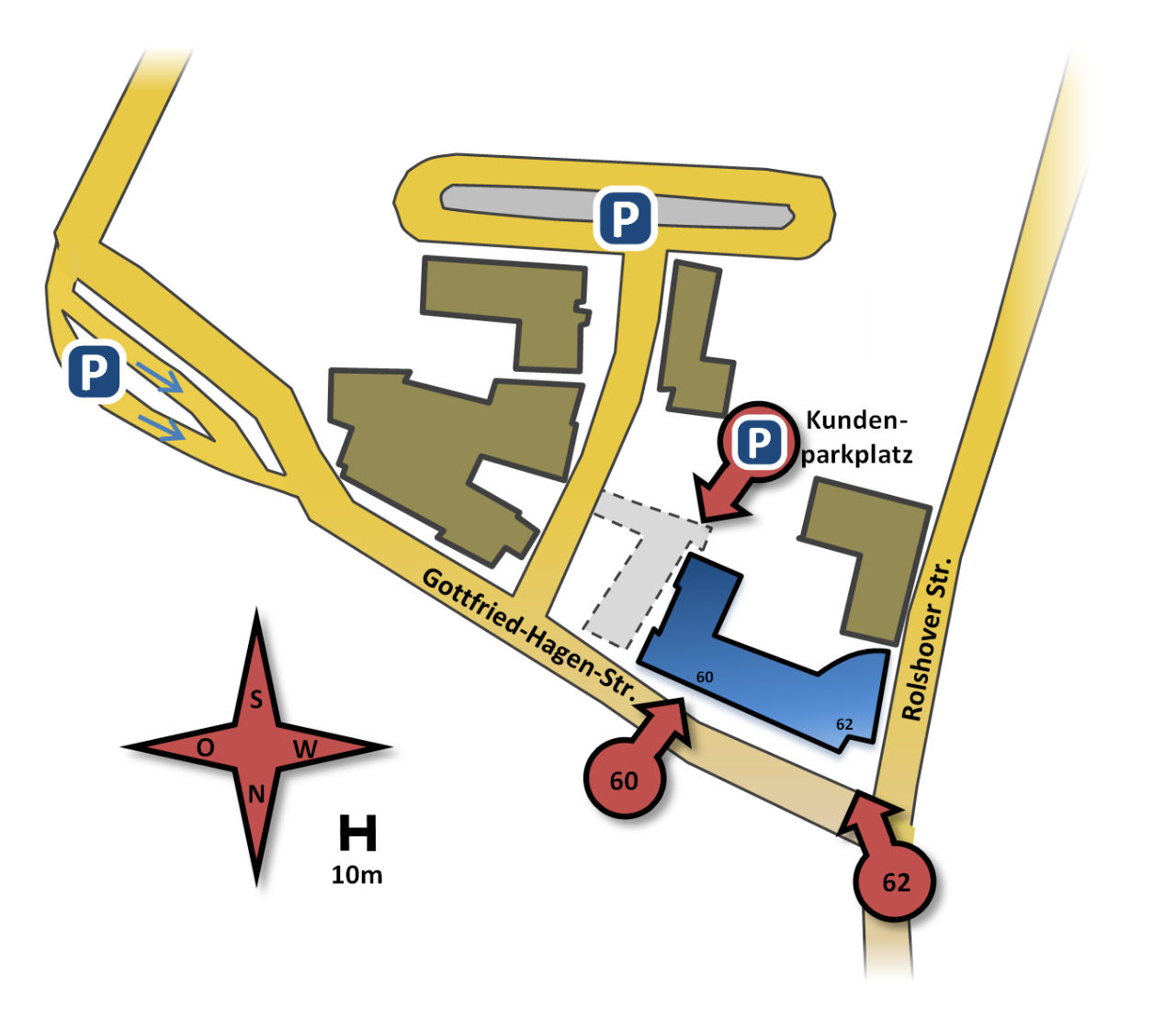 - Ca. 500m weiter erreichen Sie die Kreuzung Rolshover Str./Gottfried-Hagen-Str. und haben Ihr Ziel erreicht.