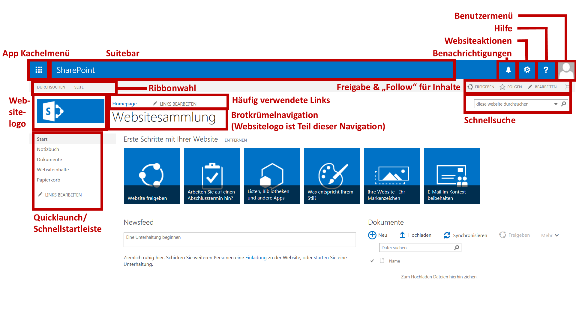 Überblick: Aufbau der Benutzeroberfläche in SharePoint Online, 2013 und 2016