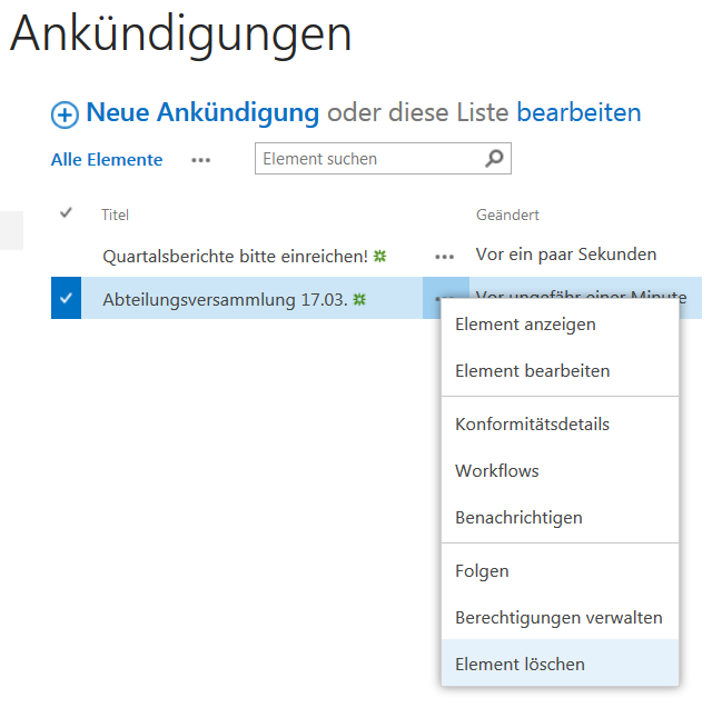 Eine Ankündigungsliste (siehe Abbildung) nimmt Neuigkeiten auf, die Sie einer Benutzergruppe