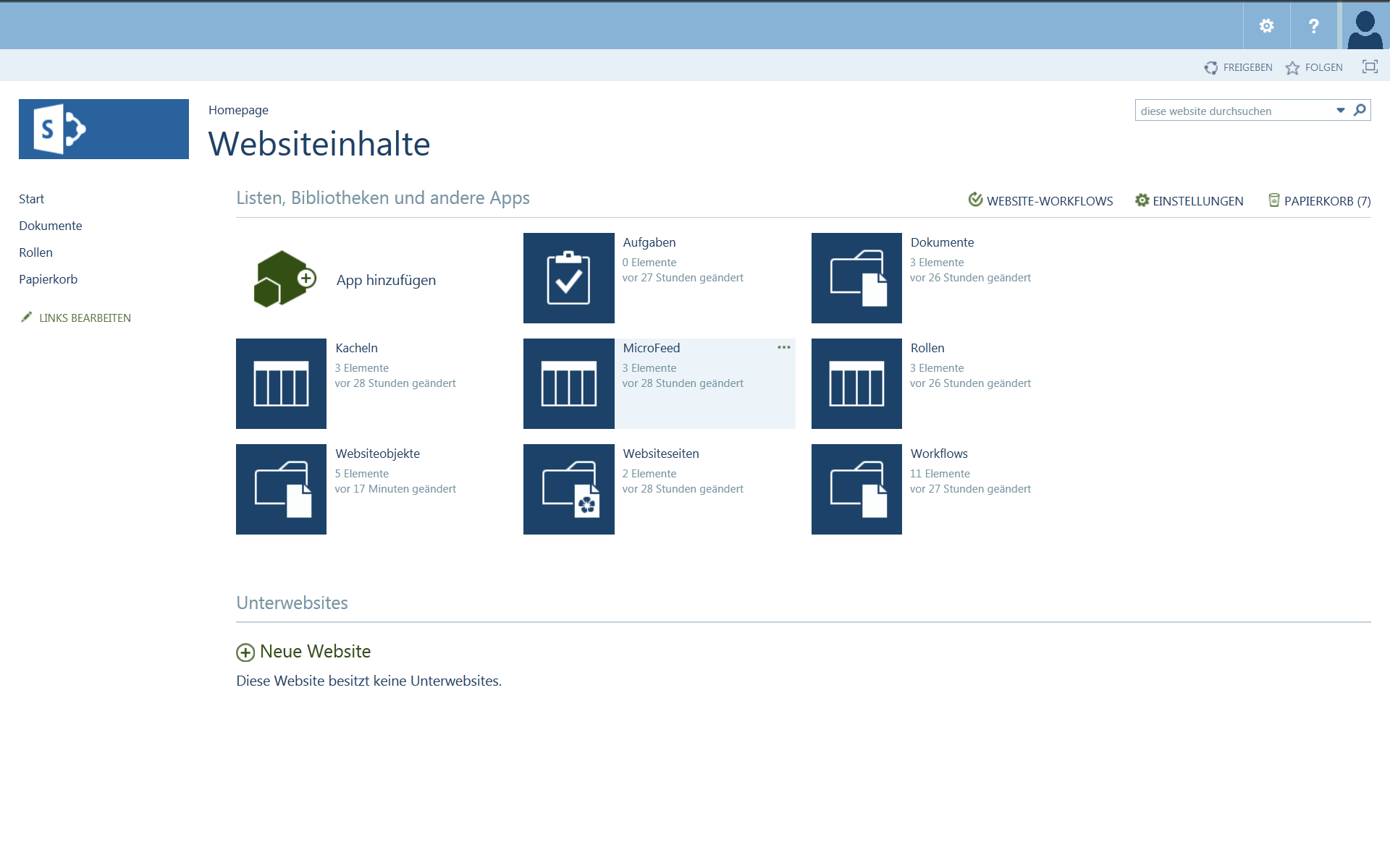 Da SharePoint eine Webtechnologie ist, besitzt eine SharePoint-Website wie jede Website im Internet eine eindeutige Homepage. Über diese können meist schon die wichtigsten Informationen eingesehen werden.